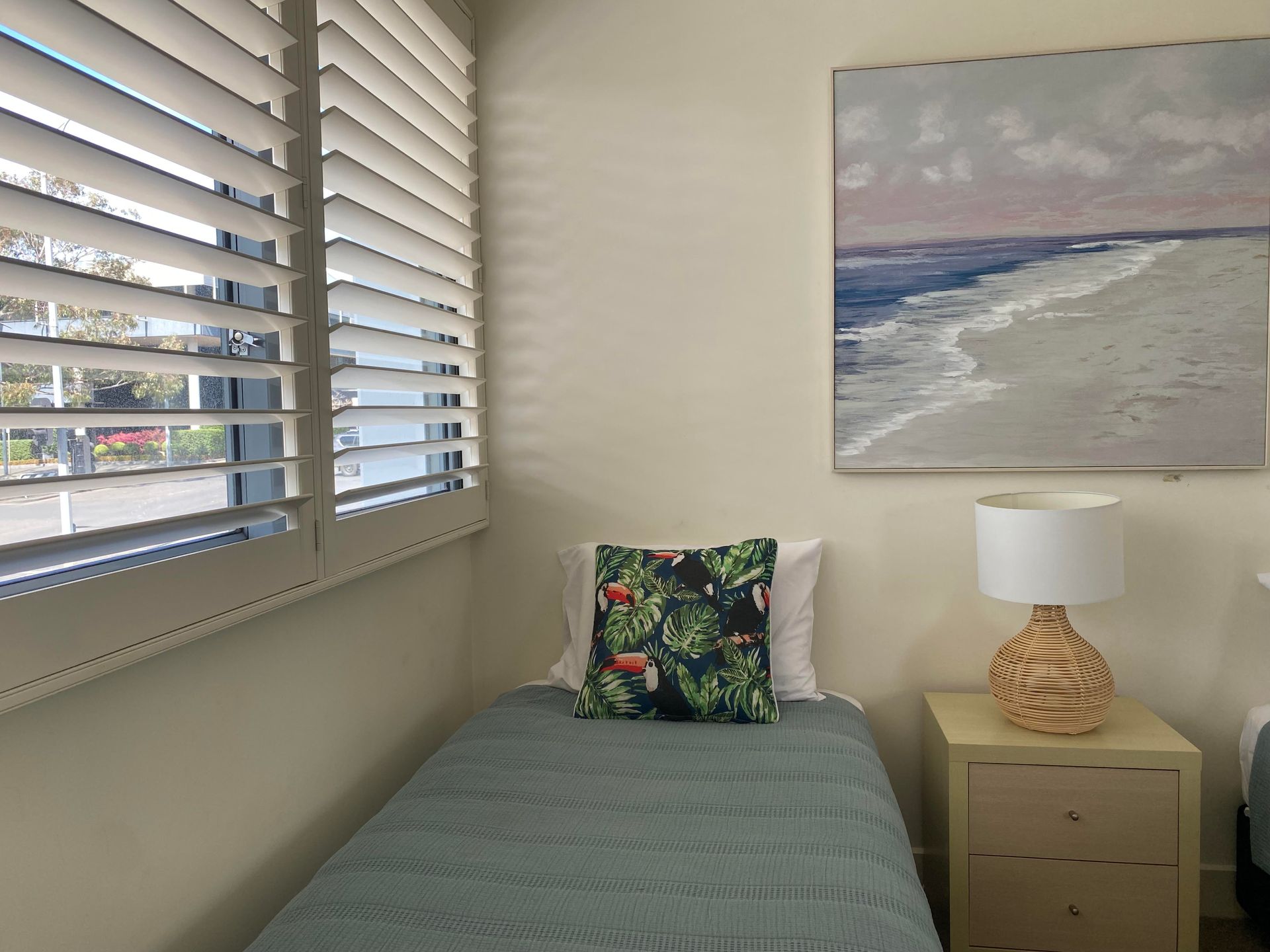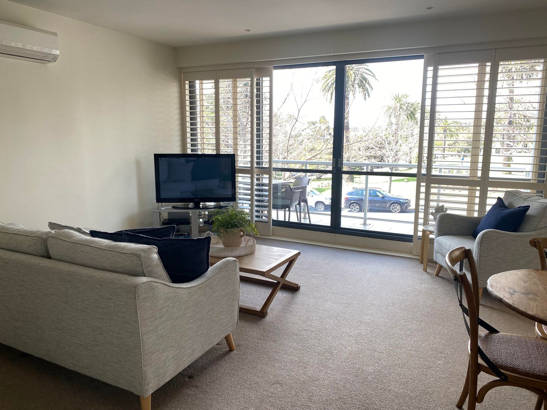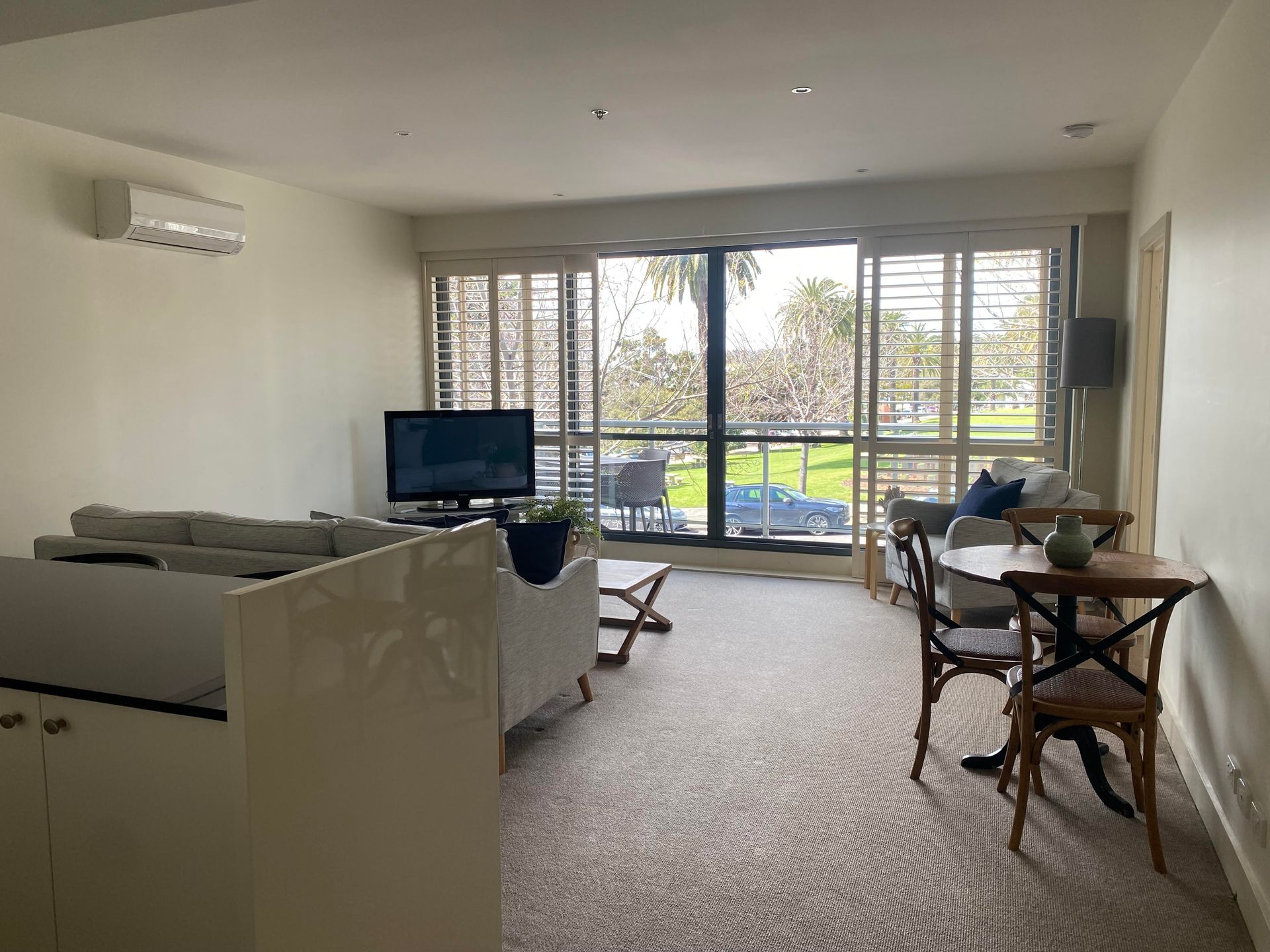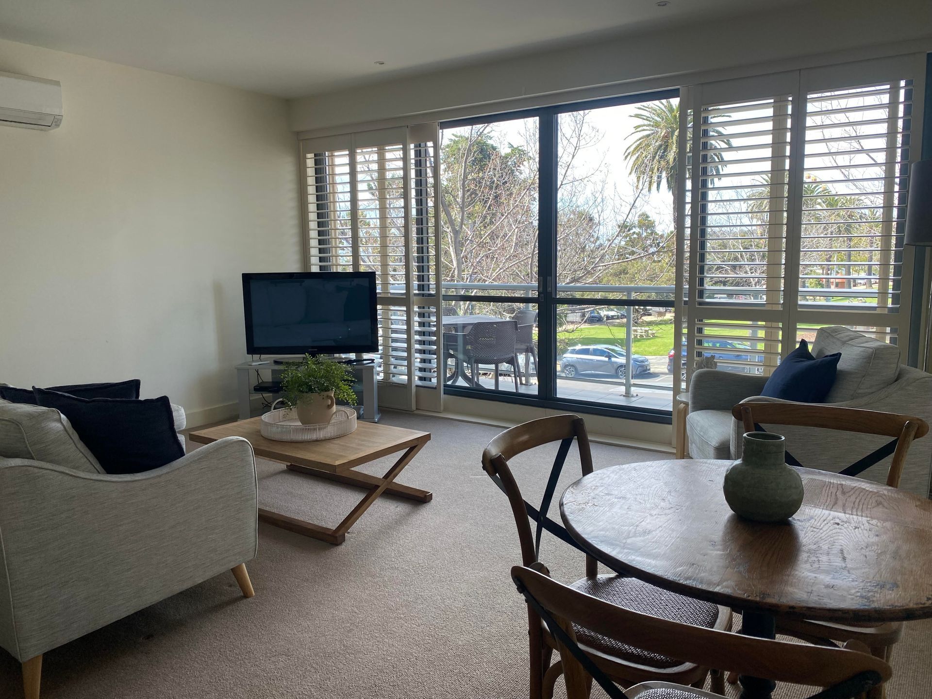 The apartment also offers a fully equipped kitchen, separate laundry, and a comfortable living and dining area that opens onto a private balcony with relaxing park views—a lovely spot to unwind.